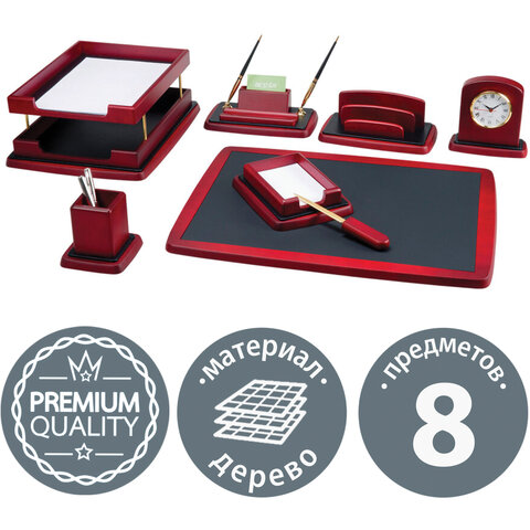 Набор состоит из 8 предметов: двойной лоток для бумаг, коврик для письма (размер — 58х43,5 см), подставка для визиток и ручек (2 шариковые ручки в комплекте), стакан-подставка для письменных принадлежностей, подставка для бумажного блока, нож для вскрытия конвертов, подставка для писем, часы. Все предметы изготовлены из дерева красного цвета с золотистой фурнитурой. Набор упакован в фирменную подарочную коробку.